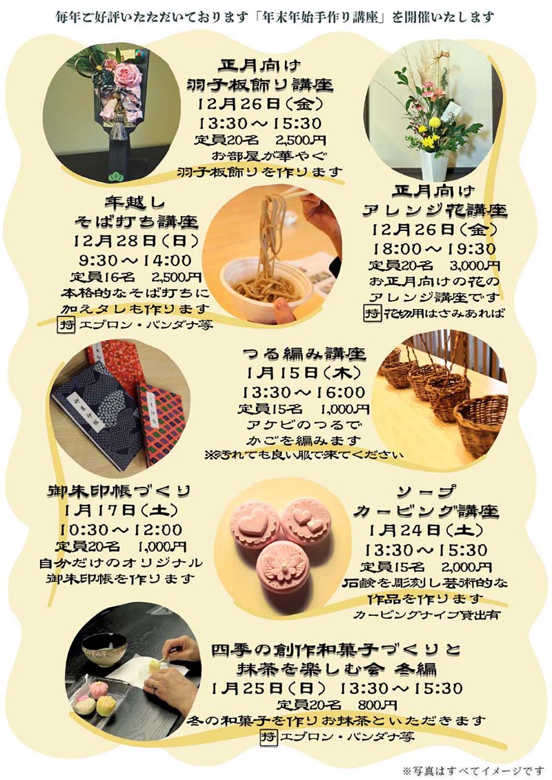 年末年始手作り講座開催のお知らせ 2025年12月3日 東の杜からのお知らせ, ピックアップ 毎年人気の講座が目白押し! 12月3日(水) 10:00より受付開始いたします。 ※電話でのお申込みはできません。直接東の杜へお越しください。 またお申込みはご本人様、ご家族のみとさせていただきます。 東の杜 年末年始手作り講座チラシ:PDFダウンロード 2025-12-03T15:43:43+09:00 ひがしねどっとこむ